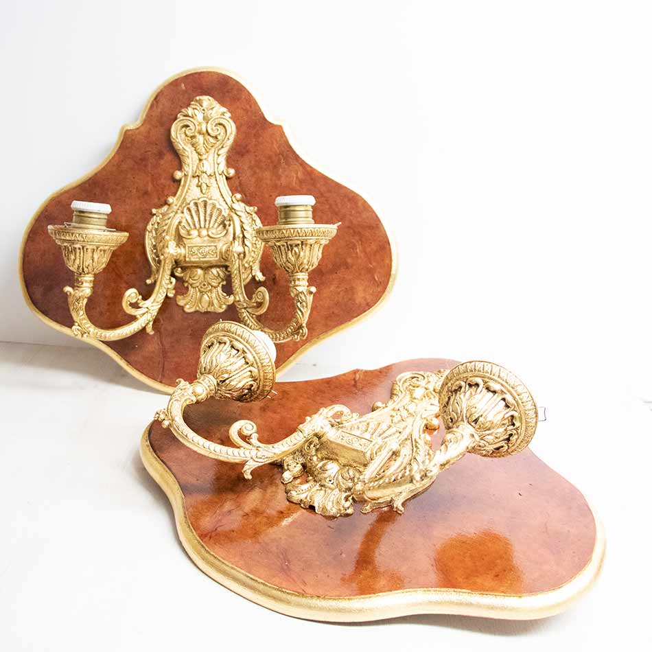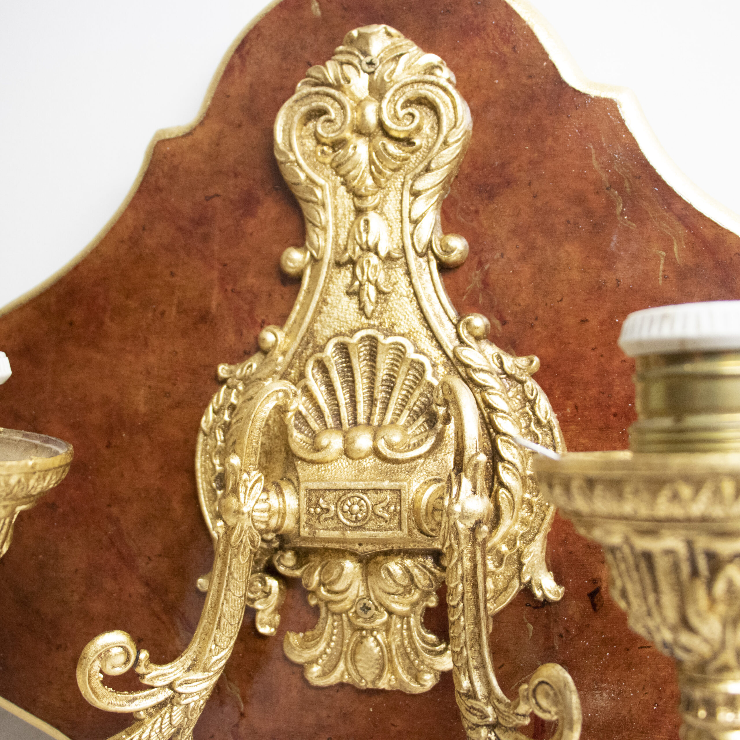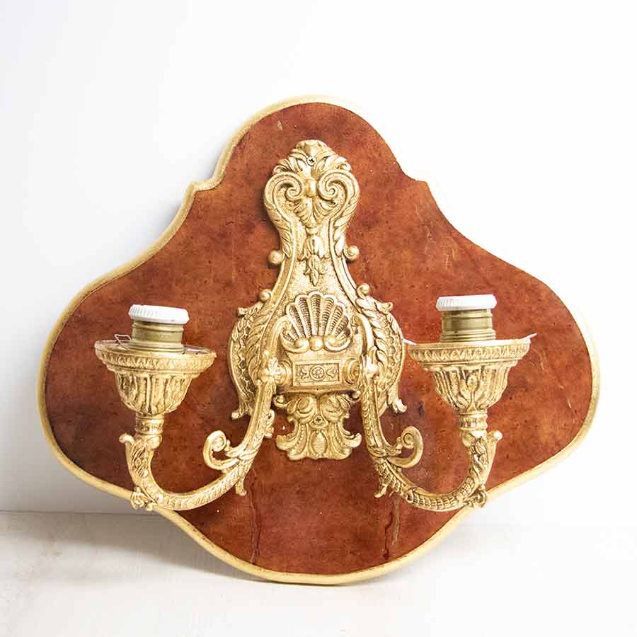 Aplique de pared con imitación mármol rojo y filos dorados en pan de oro. Brazos de metal. Instalación nueva.