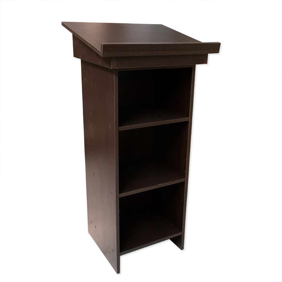 Atril sencillo realizado en tablero de melamina en color nogal, con baldas en la parte interior.
