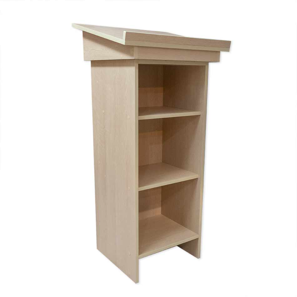 Atril sencillo realizado en tablero de melamina en color roble claro, con baldas en la parte interior.