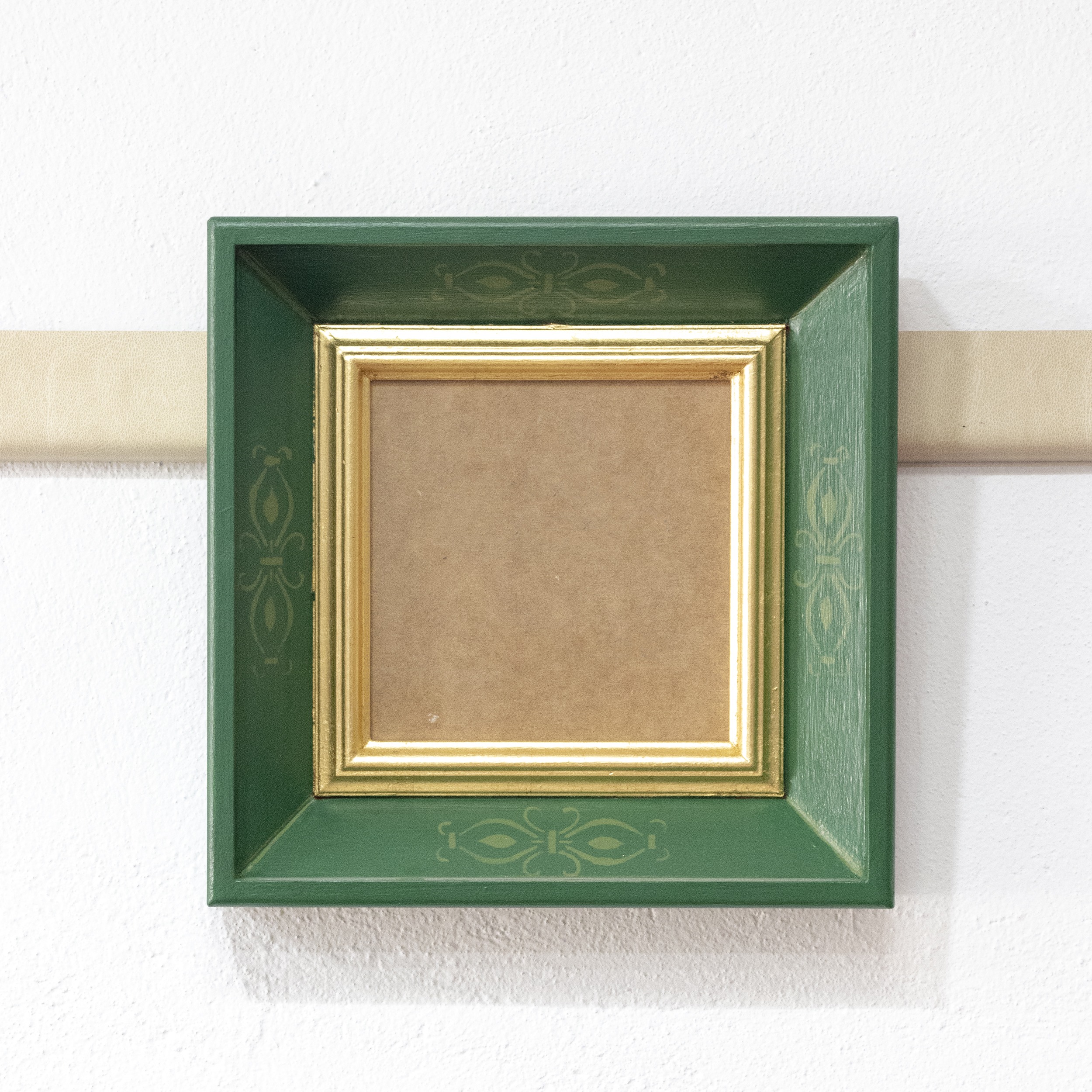 Marco cuadrado policromado en verde con detalles y filo dorado en pan de oro.