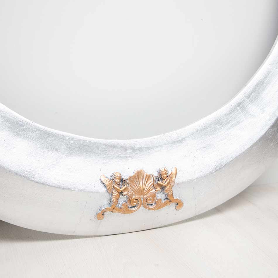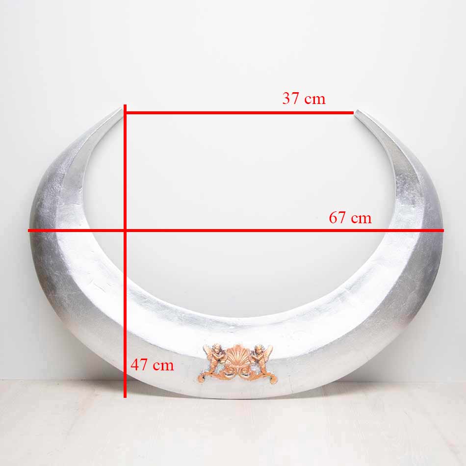 Media luna para Imagen Mariana plateada en pan de plata con detalle en la parte central con pátina de «oro viejo».