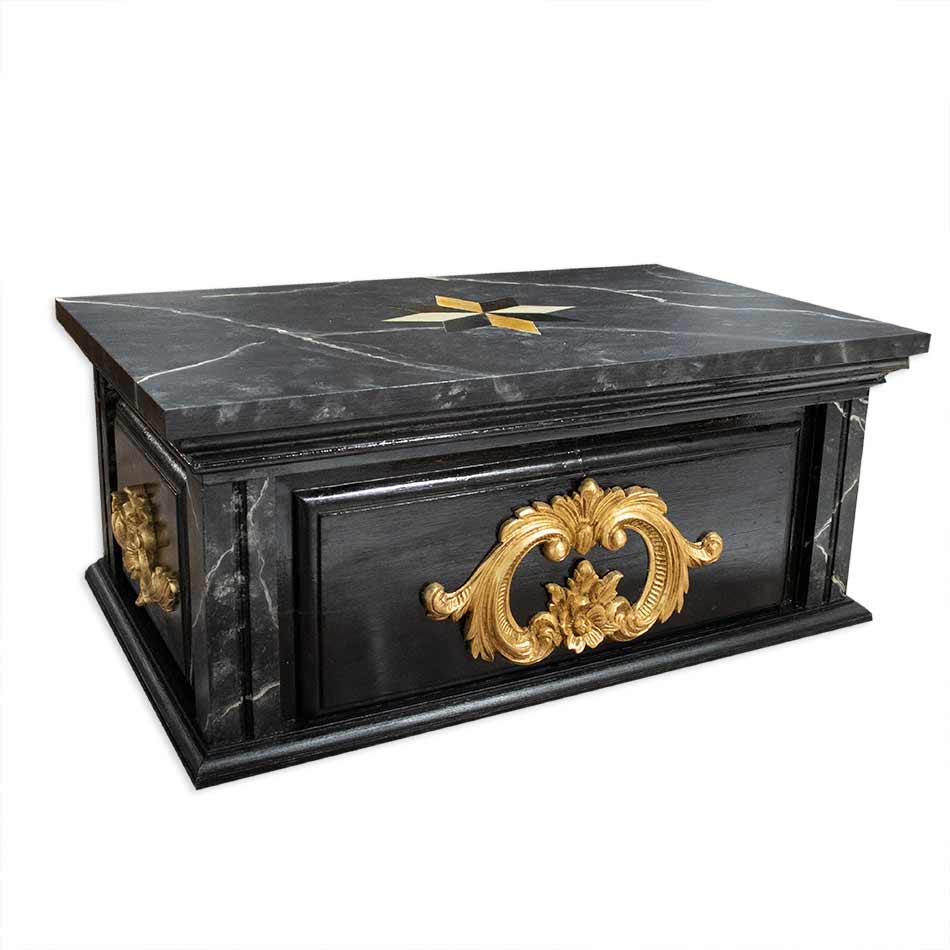 Peana para imagen con imitación a mármol negro, tallas doradas y dibujo geométrico en la base.