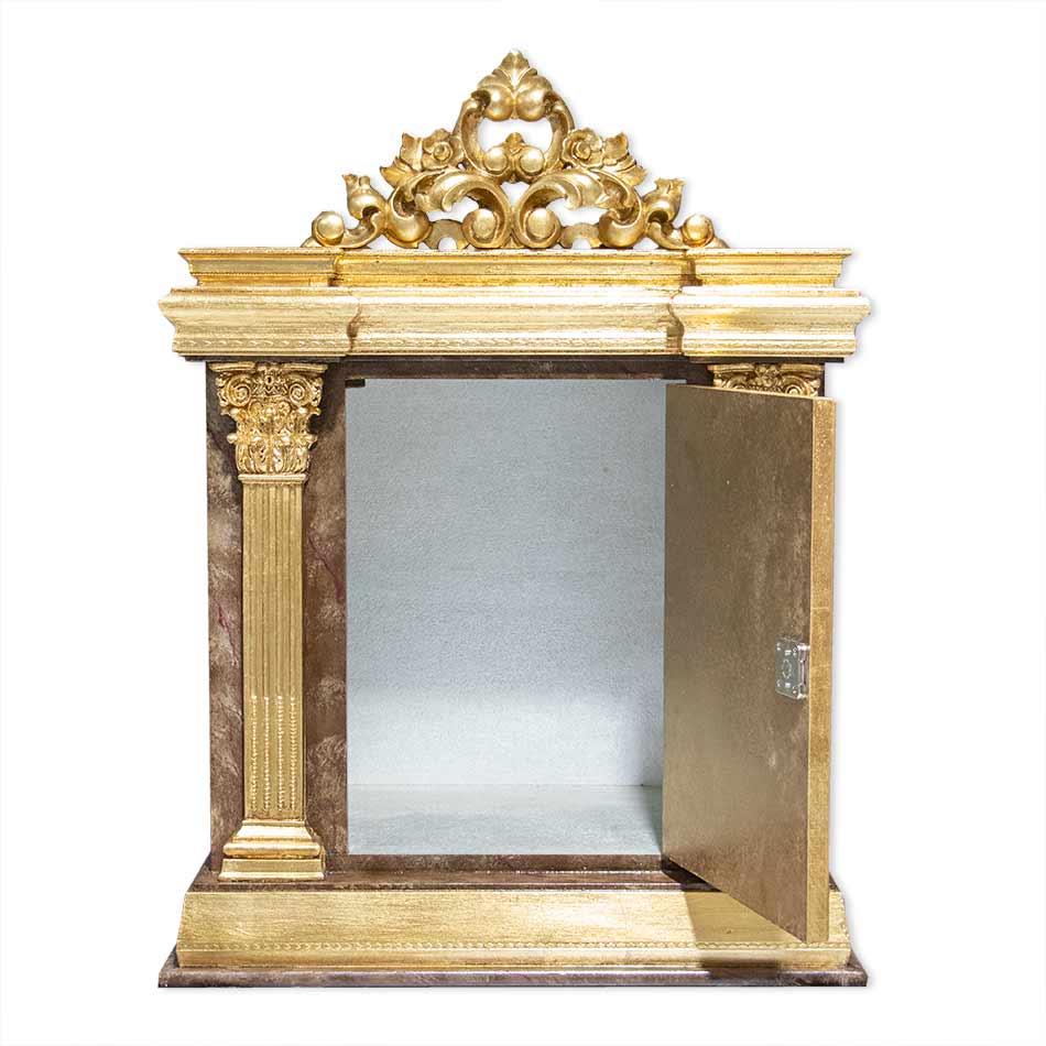 Sagrario con imitación a mármol marrón. Puerta con cruz con imitación a carey. Dorado en pan de oro.