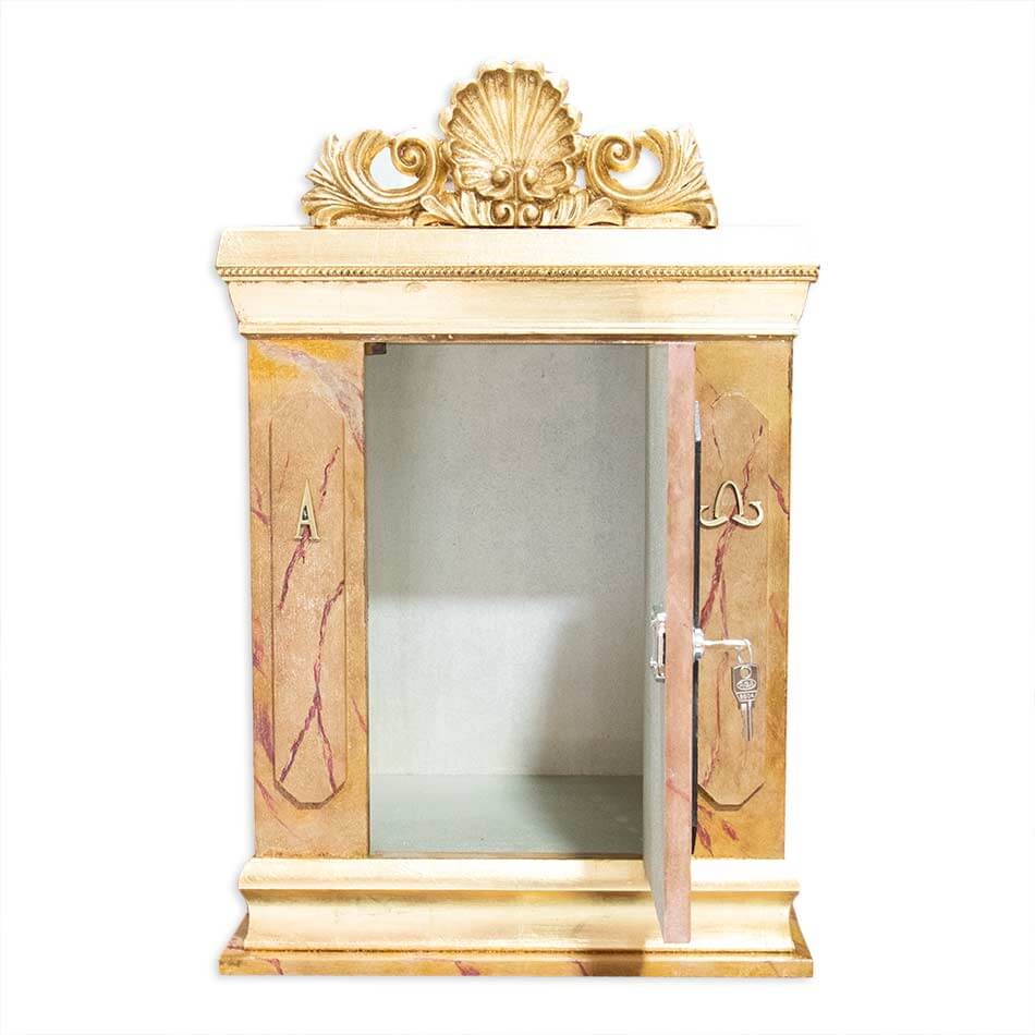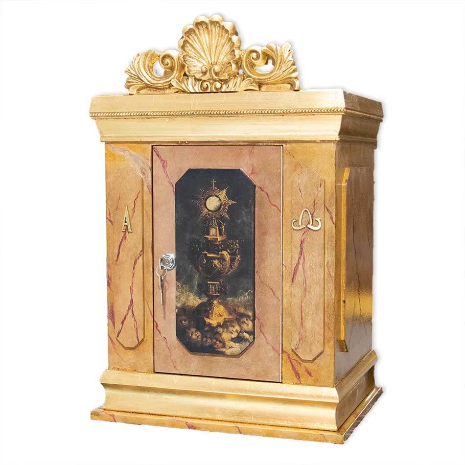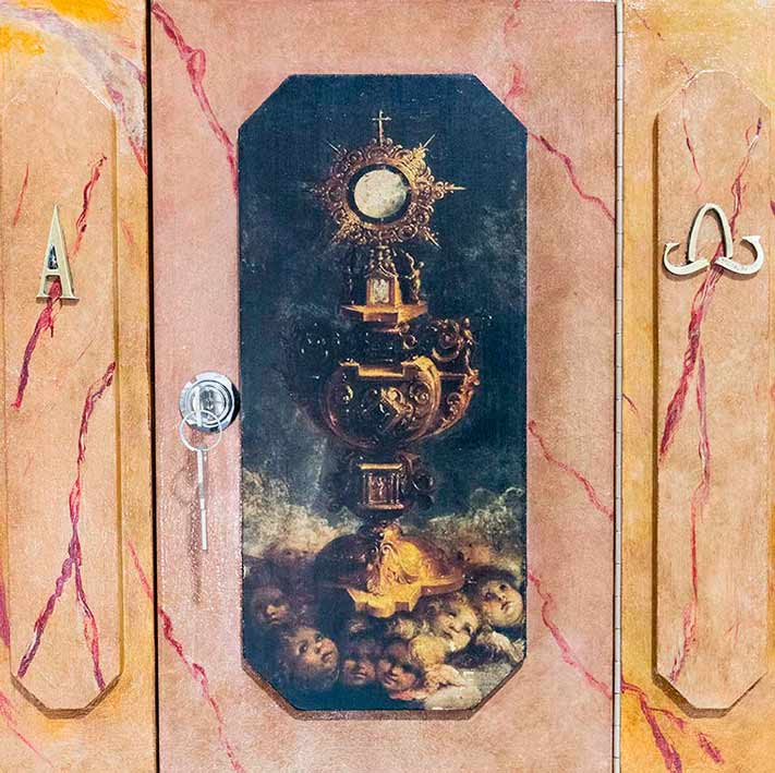Sagrario con imitación a mármol y dorado en pan de oro. Detalle de Alfa y Omega, y lámina imitación pintura en la puerta.