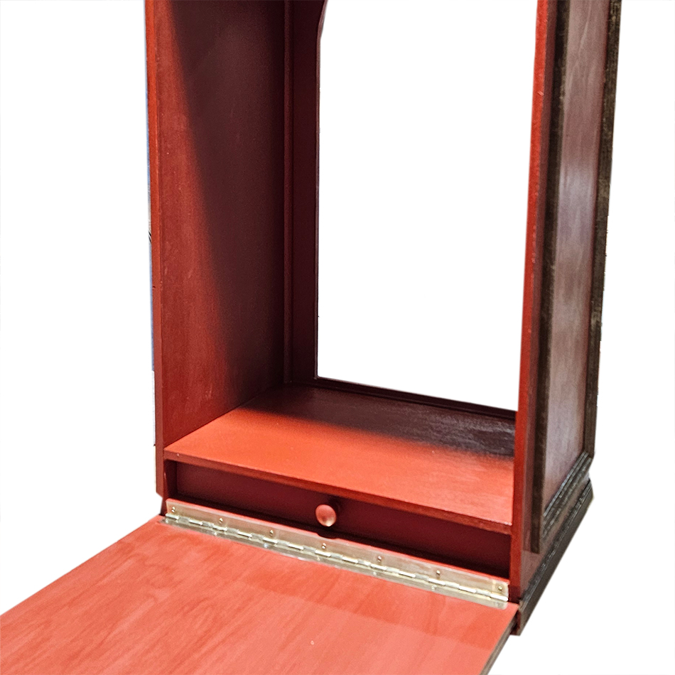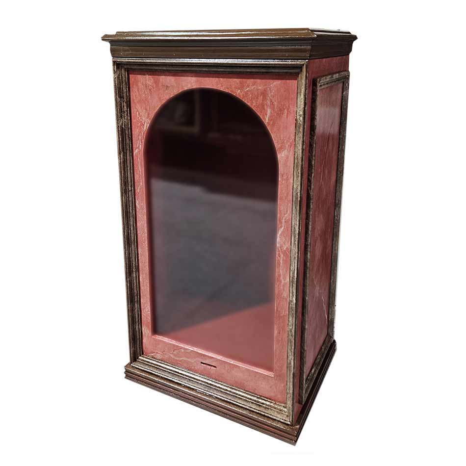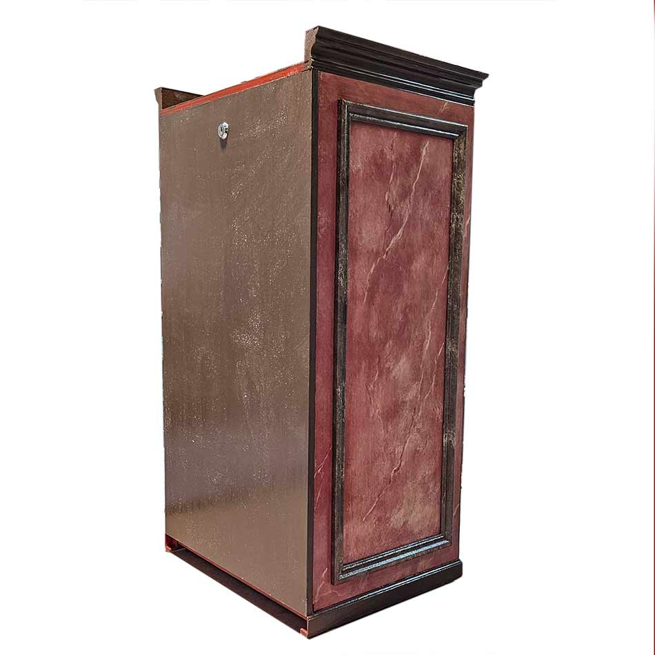 Urna / capilla domiciliaria para imagen, con imitación a mármol rojo Torcal y marrón. Interior policromado en rojo maestranza. Apertura por la parte trasera con cerradura. Asa en la parte superior
