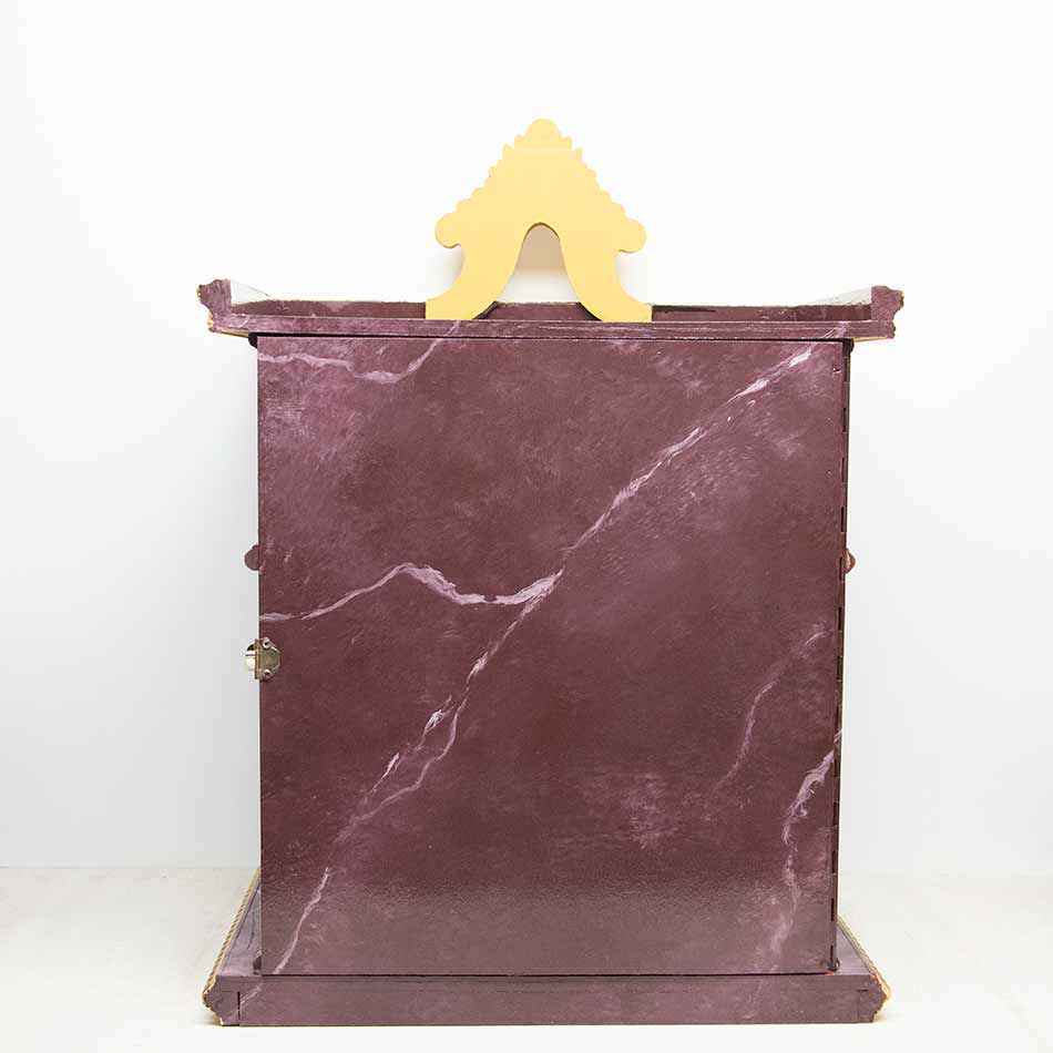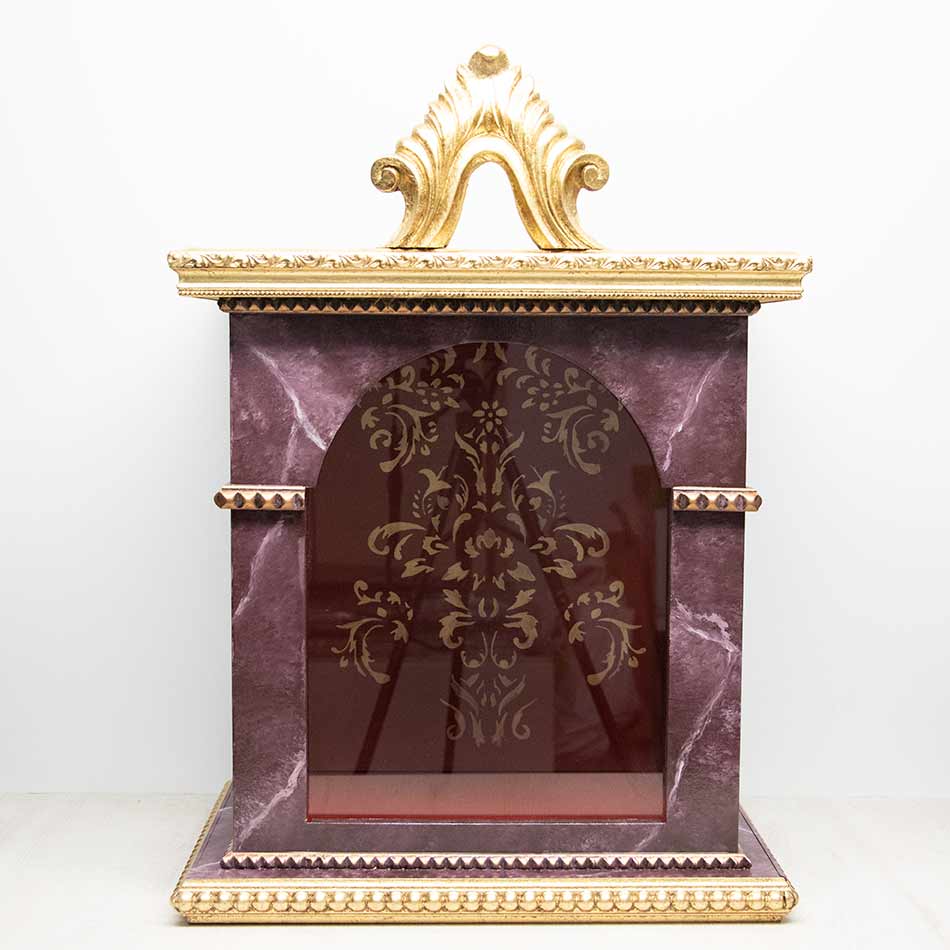 Urna para imagen con imitación a mármol, dorado en pan de oro y pátina de dorado con desgaste. Dibujo pintado a mano en el fondo. Apertura por la parte trasera.