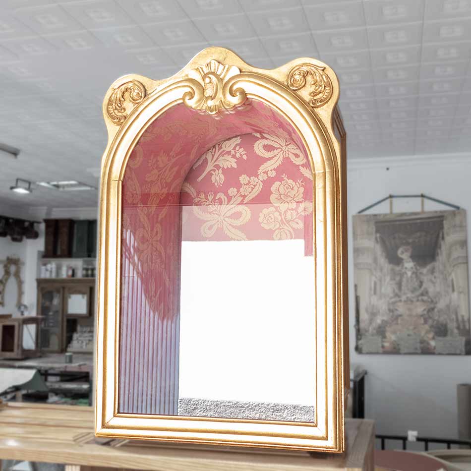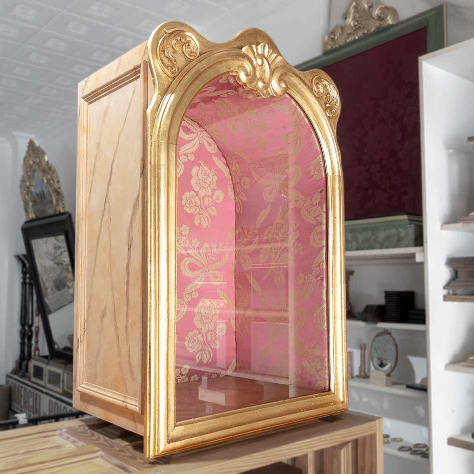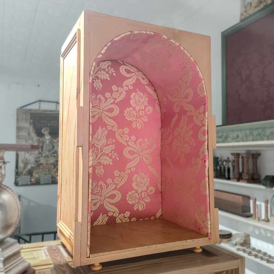 Urna para imagen con exterior con imitación a mármol y frente dorado en pan de oro e interior tapizado en damasco. Apertura por la parte delantera.