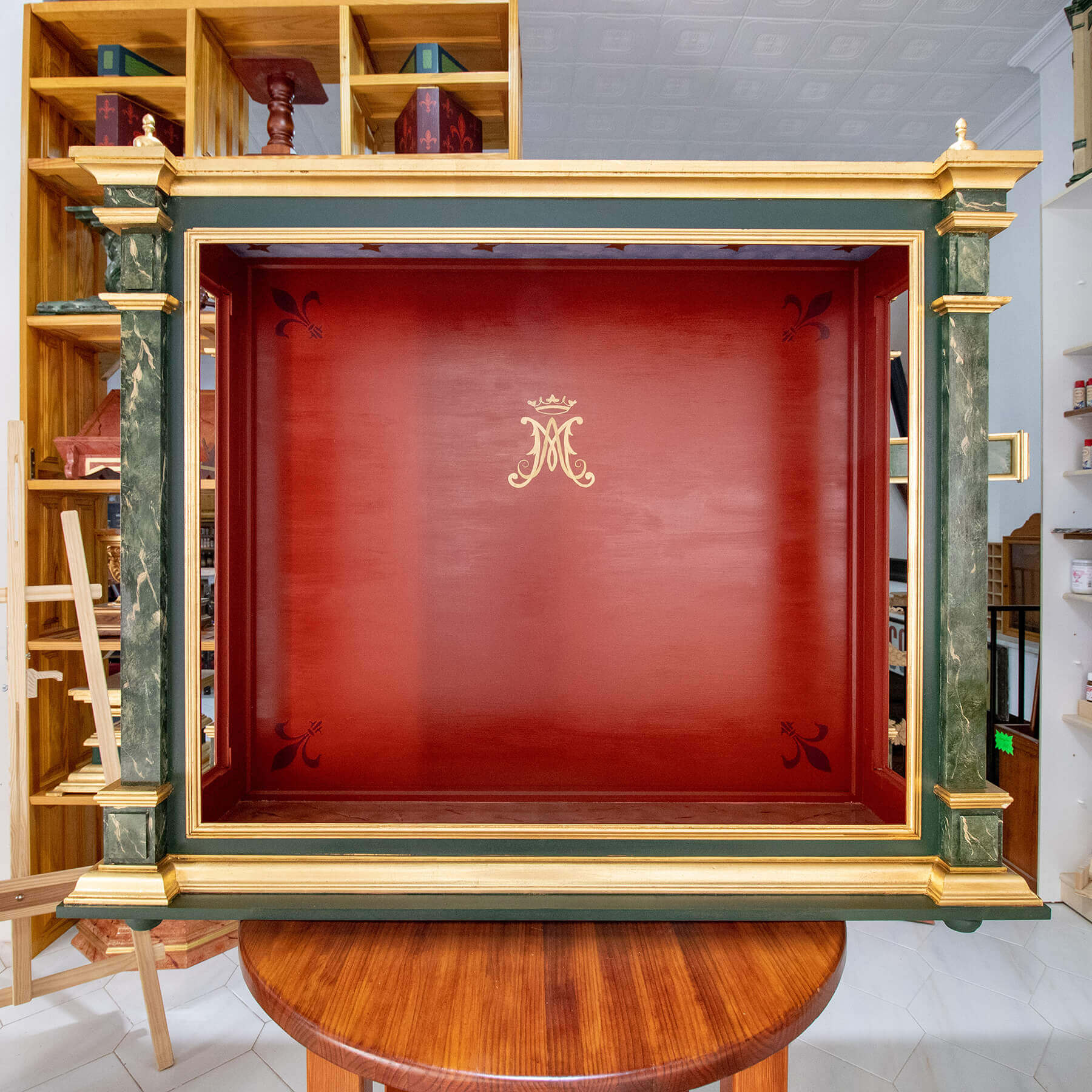 Urna marmoleada en verde con detalles dorados en oro bajo.